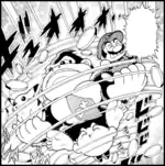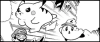 A Pikachu loosely based on the one from Super Smash Bros. appears in the one-shot manga chapter The Nintendo All-Stars Free-For-All! Smash Brothers.[1] It appears as a doll residing in a realm known as the Toy Kingdom, a land where dolls come to life at a certain time of day. It awakens alongside Mario, Kirby, and Donkey Kong. After Kirby inhales some bananas that Mario had intended to give the Kong, however, Donkey Kong flies into a rage and begins to chase Pikachu, mistaking it for another bunch of bananas. Kirby steps in to save Pikachu by painting himself to resemble a Poké Ball, and after being thrown by Mario, he spits out Yoshi. While Yoshi is able to stop the fight with his Egg Throw, Mario, Donkey Kong and Kirby continue to bicker as Pikachu watches from the sidelines, despite Link's efforts to soothe the enraged characters with his Ocarina.