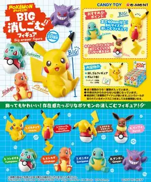 Pokémon: BIG Eraser Figure (Japanese: ポケットモンスター BIG消しごむフィギュア Pocket Monster BIG Eraser Figure) is a set of figures released by Re-Ment in Japan on June 19, 2017[1]. The figures are all shaped like various Pokémon and can also be used as erasers. Boxes contain eight packs of all eight types. They are priced at ¥450[1] per pack or ¥3,600 for a box of all eight types.