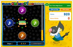 Chatot's Chime-Time Challenge was a game where players copied the exact rhythm a Chatot played. First, they listened to Chatot's rhythm. Then, they had three seconds to memorize. After this, players attempted to play the exact rhythm Chatot played, with only three errors being allowed and only one chance to listen to it again, with another three seconds to memorize it again. There was also a meter on the right of the screen. If players earned a score of either Good!, Great!, or Excellent!, they played a special bonus challenge. In this challenge, players clicked as many lit-up buttons as they could before the meter dropped down to the bottom.