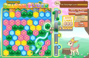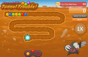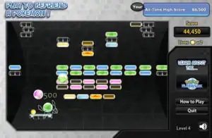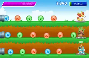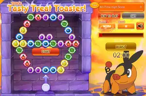 Tepig's Tasty Treat Toaster! was an online game in which players aimed to eliminate all of the orbs in the level by shooting them with matching orbs to create a chain of three or more. When this happened, the chain disappeared and any orbs being held by it alone fell, earning points. Players might bounce orbs off the walls. A chain of 3 granted 300 points, a chain of 4 granted 400 points, a chain of 5 granted 500 points, and each orb that fell granted 200 points. Any chain that disappeared would appear on the ground as a Berry in varying sizes depending on the size of the chain, but individual Berries do not. Every once in a while, Tepig burned the Berries to leave more space for Berries to appear on the ground. Regardless of whether Tepig actually burn the Berries, they supplied Tepig with food, which increased the colored-in part in the Burst meter. When the Burst meter was full, players were able to make Tepig unleash a flaming attack that obliterated Berries of a selected kind. Berries that disappeared from using said attack did not supply Tepig with food. At the start of a level, the game waited for players to click the "Start" button before the timer started counting down, and they could read the "How to Play" but not press the "Quit" button. The game ended when players had an orb touch the shooter, ran out of time, or beat the final level.