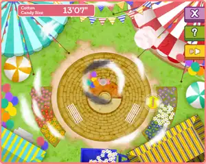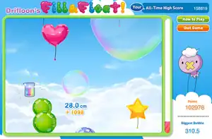 Drifloon's Fill & Float involved players making the biggest soap bubble that they could, while avoiding balloons so that they didn't get popped. This game was set in the sky. To make the bubble appear, players clicked somewhere in the screen and should not release the mouse unless they want the bubble to stop growing and let it go. On the right of the screen was a gauge known as the bubble meter. It shows how much soap is left. If it ran out the game woould end. There are two extra bubbles, one that slightly refilled the bubble meter and another that froze the balloons. A Drifloon icon also appeared, which made the balloons temporarily disappear.