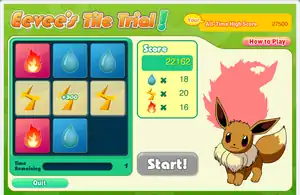Eevee's Tile Trial! was a game reminiscent of a sliding puzzle in which players slid tiles around and aligned three of the same tiles in a row or column to earn as much points as they could within approximately three minutes. There were three types of tiles, corresponding to each of Eevee's original Evolutions: Water, Electric, and Fire. When players lined up three of the same type of tile, the tiles disappeared from the board, earning points. At the beginning of the game, players chose one of the three types. If they focused on clearing more tiles of that type, then Eevee evolves, resulting in an Evolution Bonus in which players were awarded 10,000 points. Periodically throughout the game, a row or column would be outlined in blue — if players cleared a line of a certain type, then they earned an extra five seconds of time.