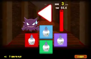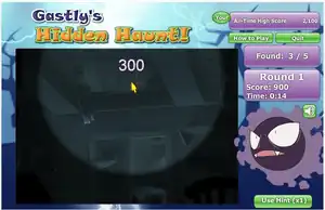 Gastly's Hidden Haunt! was an online game where players aimed to click on webs (which blinked at the start of a level) as quickly as they could to find Gastly. Players gathered all of the webs in the house, as Gastly was always hiding in the last web. Players moved around the house by using the arrow keys, or by moving the mouse cursor to the edge of the mini-game's screen. Clicking on the purple power-ups provided additional points as well as a hint that could be used to make the webs blink once again, temporarily stopping the timer and rendering them unclickable while flashing. On the first round, players had 1 minute to find Gastly. Each progressing level provided players 15 more seconds.