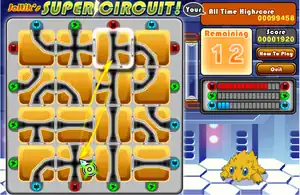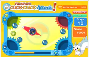 Pachirisu's Click-Clack Attack! was a game featuring Pachirisu. Here, there were a bunch of Pokémon disks, which should be hit into holes. More points were received when more than one Pokémon in the same evolutionary line were in the same hole. If two Pokémon in the evolutionary line hit each other when they weren't in a hole, they fuse into the Pokémon's Evolution. For example, if two Budew were to hit each other, they fused into a Roselia. If that Roselia hit another Budew, they fused into a Roserade. Evolved Pokémon were worth more points than unevolved Pokémon. During a couple of rounds, players must put every Pokémon into a hole in one shot. During others, a Lucario covered with stars appeared. If the Lucario went into a hole, a bunch of stars appeared near it. This temporarily raised the amount of points received from hitting a Pokémon into that hole.