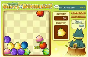 Munchlax's Berry Bonanza! revolved around Munchlax. In this game, players matched Berries of the same kind. When three or more were put together, they disappeared and players earned points. If players managed to match many of these Berries, rarer Berries appeared. When matched, these provided players with more points. The later in the game the Berries were matched, the more points players received. Players had 100 Berries. The game ended when the screen a Berry came above the screen or if all 100 Berries were used. If there were eight or less Berries on the field, Munchlax jumped and made eleven more Berries fall to fill the puzzle up more with a 3,000-point bonus.