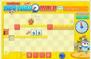 Pokémon Tick-Tock Walk! was an online game where the goal was to get Pokémon to collect a key and go to the door by a certain time. Players controlled either a Chimchar, Piplup, or Turtwig clock, and must get the clock. This did not come easy however. Players must insert blocks for them to be able to reach the key and any coins or stars. Extra points were gained when said coins and stars were received. Also found in the levels were type blocks. Depending on a Pokémon's type, time was lost, added, or not be changed. For example, Chimchar earned extra time when going through a Grass block, had nothing happen to it when going through a Fire block, and lost time when going through a Water block.