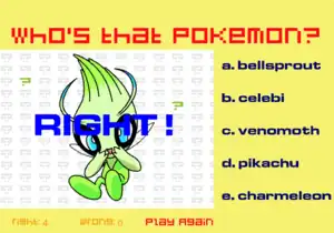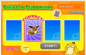 Psyduck's Shuffle Surprise! was a game which consisted of four cards, each containing a Pokémon in the center, for example, Medicham, Xatu, Cubone, and Jigglypuff. Players were instructed to remember one of them, whose name was displayed around the top. The cards were then shuffled around, and players must find the right card they were told about in the beginning. Every time players got it right, Psyduck jumped. Every time they got it wrong, Psyduck shook its head. Players had three lives, and every time players chose the incorrect card, one is lost. When the game ended, Psyduck jumped onto the screen and pointed its bill at the level reached and then the score received. If it was their all-time high score, it was recorded on the top-right corner.