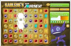Sableye's Gem Journey! was an online game where the goal was to earn as many points as players could by lining up three type-themed marbles of the same type. Players lined up the marbles by switching the adjacent fields. When players lined up the marbles in such a way that the Sableye in the screen could move, gems appeared. Nine gems appeared in three colors: red, blue, and yellow. Gems only changed position either when it was moved to make a match, or when Sableye collected it. As players matched marbles to earn points, a gauge filled, and once the gauge was full, players could wipe a row or column of marbles, resetting the gauge. Below that gauge are counters for gems. If players lined up the marbles close to the Sableye, it tried to go to the nearest gem and collect gems directly adjacent to it. 5000 bonus points were awarded once Sableye filled each gem counter, which then resetted after Sableye came to a stop.