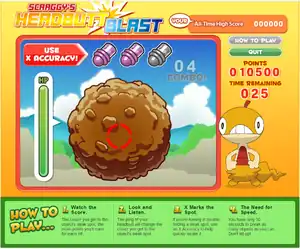 Scraggy's Headbutt Blast was an online game with the goal to smash as many watermelons, ice blocks, and rocks as possible in a time limit of 30 seconds. Hitting an object's "weak spot" always destroyed it in one hit and also awarded significantly more points than hitting it anywhere else. The ping that the Headbutt produced changes, and the points awarded increased as headbutts came closer to the weak spot. Using an X Accuracy revealed the location of the object's weak spot, but players could only use up to 3 of these items in a single game. On the first three levels, the location of the object's weak spot was automatically revealed, and it became impossible to use an X Accuracy. Every object had a visible HP bar along the left side. HP was taken away with each Headbutt that players make, which eventually caused the object to be smashed and quickly replaced with another one. Combos were achieved when objects were broken roughly within 3 or 4 seconds of each other, allowing players to earn a higher final score.
