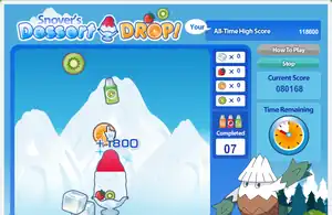 Snover's Dessert Drop! was an online game where the goal was to create shaved ice desserts. Players controlled a cup at the bottom of the screen, and pieces of strawberry, orange, and kiwi fruits; ice cubes; and syrups would fall from above. The goal was to gather fruit and stack the shaved ice as tall as possible, and then top it off with syrup to earn points and empty the bowl. Bonus points were awarded for collecting all of one flavor (for example, three strawberries and strawberry syrup), or for using all flavors (one each of strawberry, orange, and kiwi, and topped with rainbow syrup). Doing a single flavor for the whole bowl also extended the time on the clock. Occasionally, tokens also fell that alternated between a sun and a picture of Abomasnow. Collecting the token in the cup when it is a sun made the weather sunny, melting the dessert so that they could start over; collecting it as an Abomasnow caused a blizzard, making the ice cubes bigger. When time ran out, points were tallied, with extra points added at the end for the number of desserts completed.