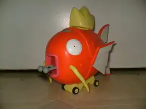 The submarine is on wheels and can be rolled around on a floor or other flat surface. In the back is a propeller that spins as the wheels roll. The submarine has two "entrances": on the left side, there is a doorway to a large interior space underneath Magikarp's fin, and on the top Magikarp's top fin can be moved to reveal a separate, smaller interior space.
