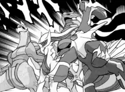 Hareta's main goal for this manga was to meet Dialga. It was also the Pokémon summoned by Cyrus at the Spear Pillar, though Palkia also appeared after he had been stopped. Later, Charon sought to control Giratina, leading to Hareta having a battle with it in the Distortion World.