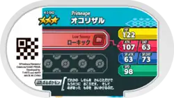 Primeape (Japanese: オコリザル Okorizaru) is a Grade 3 Pokémon Mezastar tag. It is part of the third Gorgeous Star set.