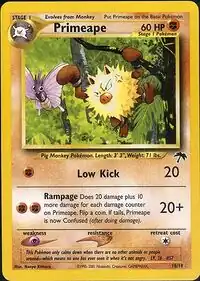 Low Kick is a move in the Pokémon games that Primeape can learn. Rampage is an attack that first appeared on Tauros from Jungle. This card's Pokédex entry comes from Pokémon Yellow, though it is heavily reworded.