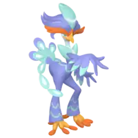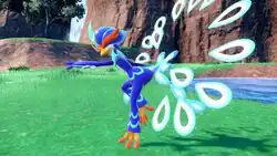 In battle, Quaquaval is accompanied with a series of teardrop-shaped decorative water feathers, which are ejected from the organs on its tail feathers and fanned out behind its back. When attacking, these water feathers move forward and spin around Quaquaval's body, making a buzzsaw-like arrangement that it uses to slice into its enemies. Quaquaval's legs are well-trained and have incredible strength, being able to launch a truck away with a single kick. It uses its legs to perform dance moves, some of which appear to be based on dances from faraway lands.[1] Quaquaval is viewed by Tsareena as its rival. Quaquaval's dances can mesmerize all those who see it. Even while Quaquaval is asleep, it has been seen swaying its whole body at every opportunity. On occasion, a sleeping Quaquaval has been seen striking elegant poses.