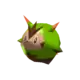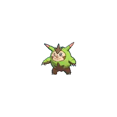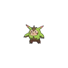 Quilladin is a bipedal, mammalian Pokémon with some plantlike features. Most of its body is covered by a green, armor-like shell similar to a chestnut. The shell covers everything except its face, lower body and legs, and the undersides of its arms. The visible parts of its body are dark brown, except for its lighter face. The face has dark, oval eyes, a small, pink nose on a pointed snout, a dark brown, sideways triangle on each cheek, rodent-like incisors, and a three-pointed patch of dark brown fur on its forehead. On either side of its head is a large, ear-like spike with reddish tips. Its tail also has a reddish tip. Its shell is banded over its arms and on its back, and the fur on its lower body creates a three-pointed pattern on its front. Quilladin has three white, clawed digits on its hands and two on its feet.