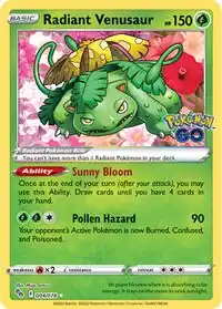 Radiant Venusaur (Japanese: かがやくフシギバナ Sparkling Fushigibana) is a Grass-type Basic Radiant Pokémon card. It is part of the Pokémon GO expansion.