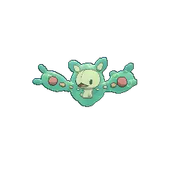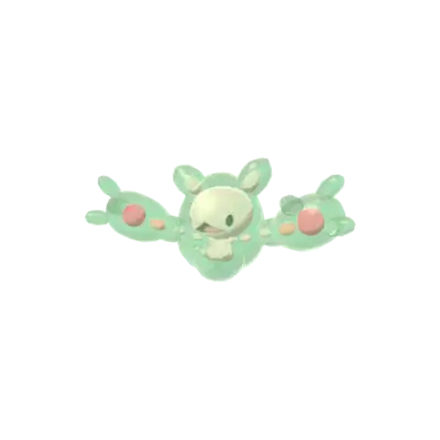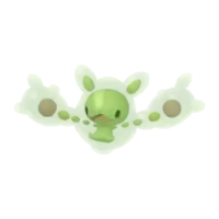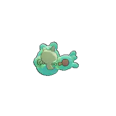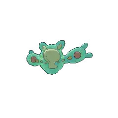 Reuniclus is a pale green Pokémon surrounded by a blob of translucent, green gelatinous substance. It has a large, round head with a thin stripe down the center. Its eyes are black and oval, while its mouth is red and triangular. Its body is small with stubby arms and legs. However, there are several round objects floating next to its arms. These objects increase in size and darken in color the further they are from the body and form arm-like appendages. The gel around these appendages forms three-fingered hands. Above its head, two rounded, triangular objects are suspended in the gel, giving the impression of horns or ears. The gel forms a stubby, round tail at the base of Reuniclus's body.