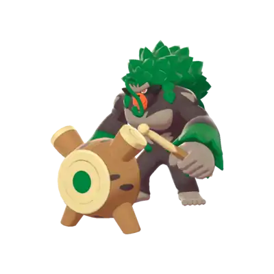 Rillaboom, the Drummer Pokémon. A Grass type. The one who is the best drummer becomes the leader, and its calm presence helps maintain harmony within its troop.