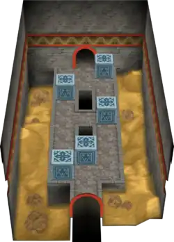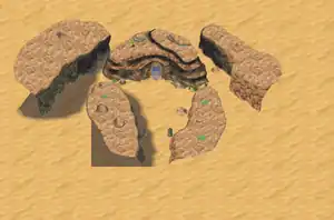 The Ruins of Abundance are located deep inside the Haina Desert, at the desert's northernmost point. As a result, the ruins are completely surrounded by desert sand and rocks. As the Haina Desert is unaccessible until the player has cleared Acerola's trial at the Thrifty Megamart (Abandoned Site), the ruins are also unaccessible until that point. Like all of the other ruins of Alola, the interior consists of a path requiring Machamp's assistance to move the big stone blocks blocking the way to the innermost room, which contains Tapu Bulu's altar.