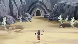 In Guiding an Awakening!, the ruins served as the site of Ash's grand trial battle with Nanu. To Ash's surprise, Nanu informed him that he was only allowed to use one Pokémon against his three. After recovering from the initial shock, Ash accepted this condition and chose to use his Lycanroc for the battle. After Lycanroc had beaten two of Nanu's Pokémon, Tapu Bulu appeared above the battlefield and dropped down a Sitrus Berry for Lycanroc to recover its health. During the match against Nanu's last Pokémon, Persian, Lycanroc seemed to go berserk again, and Ash kept yelling at it to calm down, until Lycanroc unexpectedly tackled Ash, revealing that it was in perfect control of itself and was actually using its red-eyed state as a power boost. After countering Persian's Black Hole Eclipse with Lycanroc's Continental Crush, Ash had Lycanroc use Accelerock, defeating Persian and winning the grand trial for him. Nanu then considered giving Ash a Darkinium Z as a reward, but quickly changed his mind, stating that it wouldn't suit Ash, and instead chose to reward him with a Lycanium Z.