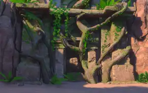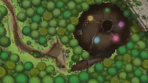 The NEO-ONE starts outside the ruins, where several Eldegoss and Houndoom can be found. The NEO-ONE will then descend into the ruins into a small room where a Noivern will fly into. This room is then followed by a large chamber with a large tree standing in the center, with only its trunk visible due to its immense height. Five statues are dotted throughout the chamber, representing the five Illumina Pokémon, along with nearby crystabloom. Several Golurk and Beheeyem are present in this chamber. As the player circles the chamber, a circle of all six crystabloom will also be present at the end of the route.