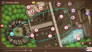 The Illumina Spot starts off in a small cave with a tree in its center. It will then enter a ruin with three rooms and circle back to the original cave. A ball of light will roam around in these rooms. If the ball is illuminated with an Illumina orb, Xerneas will appear briefly. Ancient ruins depicting a painted mural where Xerneas and the other Illumina Pokémon protecting Lental can be observed in the Illumina Spot.