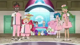 Ash arrives at the Pokémon Center just in time and introduces Poipole to his classmates' Pokémon. Nurse Joy arrives sick, prompting her Pokémon, Blissey and Comfey, to attend to her. The group offers to supervise the Pokémon Center in Nurse Joy's absence, and she agrees. The students get changed, but Ash is forced to wear the female nursing uniform. The girls use this as an opportunity to apply makeup and Rotom's Laki wig onto Ash. An embarrassed Ash declares that if he has to dress up like a girl, then Kiawe and Sophocles should as well. However, the two boys decline, revealing that they found male nurse uniforms.