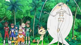 After seeing the Ultra Guardians flying overhead, Meowth decides to help Pheromosa find more Z-Crystals. Meowth flashes light at the Ultra Guardians with his golden kobana, which gets the group's attention and prompts them to land. They encounter Meowth and become suspicious when he asks them to use their Z-Moves on him. As Ash tries to use his Electrium Z, Pheromosa snatches it off his Z-Power Ring. Ash orders Pikachu to use Quick Attack, but Pheromosa dodges it. Jessie and James soon locate Meowth and notice his drastic appearance changes, including a verbal tic and standing on his toes. Meowth admits that he wishes to impress "Beauty", though Jessie simply wants the Z-Crystals back. James and Wobbuffet find Meowth's affection for the Ultra Beast to be hilarious, but Meowth is too blinded by his crush. He professes his love to Pheromosa, but the Ultra Beast runs off again, and Meowth follows.