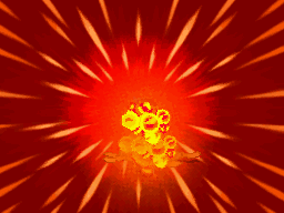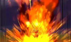 Victini crouches its body together and its whole body glows pale red. Its body then becomes surrounded in a teardrop-shape red flame. It also surrounds its body in a round yellow fire. Victini then fires the flame from its body at the opponent, and it shoots at the opponent like a spinning meteor. | ||