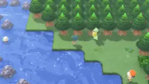As the player surfs here from Route 220, they will have two possible paths to Pal Park. On the northern path, there is a Honey Tree, no grass, and only one Trainer, a Collector. This is the easiest path to Pal Park. North of this path, a small maze of grass and trees leads to an old man who gives away an item every day. On the southern path, there is more grass, more Trainers, and a Berry patch. Note that, in order to get to Pal Park, the player must fight at least one Trainer. Two construction workers standing in front of Pal Park will prevent entrance until Professor Oak has invited the player there.