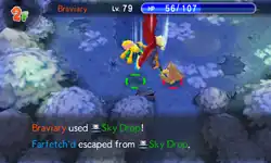 Sky Drop targets the enemy in front and brings the user and the enemy to the air (giving the user the Sky Drop status and suspending the enemy). While the user is in the air, the Pokémon cannot be hit by moves (except by moves such as Gust, Thunder, Twister and Sky Uppercut). Projectiles will also pass the user as if their tile was empty. The next turn, the enemy is thrown down and receives damage. Due to it being a two-turn move, this move cannot be linked.