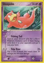 Fishing Tail is an attack that first appeared on Slowpoke from Aquapolis. Trip Over is an attack that first appeared on Diglett, one of the Unnumbered Promotional cards.