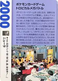 The Tropical Mega Battle was the first international exchange tournament in the history of the Pokémon TCG. It was held at a hotel in Hawaii, and was attended by elementary school students from Japan and the United States. In the courtyard where the participants gathered, the players who couldn't wait for the start of the tournament voluntarily started trading and battle. "I was surprised and happy that Pokémon cards could overcome the language barrier." (Kouichi Ooyama). "I wanted to have a Pokémon card tournament!! I want it to be serious, and I want to be able to hold a world tournament in the future. It was this event that realized that dream." (Tsunekazu Ishihara) (August 24–27, 1999) (August 26–27, 2000)