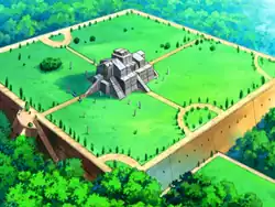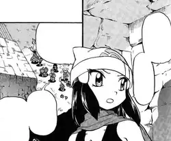 After arriving in the ruins, Ash and Kenny decided to have a battle, but it had to be interrupted when the stairs Dawn was sitting on began to lift, causing Piplup and Aipom to tumble down the steps and Dawn to jump off to save her Pokémon. Seeing that, Ash, Brock, and Kenny rushed to rescue Dawn and everyone ended up inside the ruins, where they encountered several Unown. The Symbol Pokémon living there guarded a gold-colored cube that was stolen by CommanderSaturn of Team Galactic.