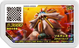 Solgaleo (Japanese: ソルガレオ Solgaleo) is a Grade 5 Pokémon Ga-Olé disk. It is part of the third set.