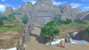 The ruins are situated at the top of a slope, and the area is snowing unnaturally due to the presence of the escaped Ice-type Pokémon who have been taken away from their usual habitat. Many Berry trees populate the area around the ruins, including Coba, Shuca, Haban, Nanab, Yache, Pinap, and Tamato Berry trees. Many fossils can also be found outside the ruins, including Skull Fossils, Armor Fossils and Old Amber. As it is the site of previous meteor shower, there are impact sites in the area as well as Pokémon such as Cleffa.