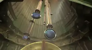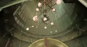 Outside in between the two towers is a long and thin winding staircase, leading up to the top of the tower. On the topmost floor lies a large machine that plays music by inserting special disks into a place-holder and pulling a lever. This is a similar function as a piano, but the strings are aligned in a cylinder.