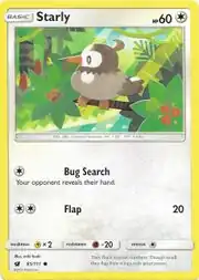 Starly (Japanese: ムックル Mukkuru) is a Colorless-type Basic Pokémon card. It is part of the Crimson Invasion expansion.