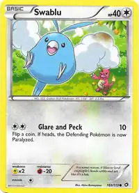 Glare and Peck is an attack that first appeared on Natu from McDonald's Pokémon-e Minimum Pack. It appears to literally be a combined Glare and Peck, two moves from the games. Swablu learns Peck, but does not learn Glare. This card's Pokédex entry comes from Pokémon Black 2 and White 2.