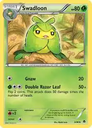 Gnaw is an attack that first appeared on Pikachu from the Base Set. Double Razor Leaf is a variant of Razor Leaf, a move in the Pokémon games that Swadloon can learn. This card's Pokédex entry comes from Pokémon White.