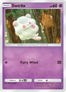 Swirlix (Japanese: ペロッパフ Peroppafu) is a Psychic-type Basic Pokémon card in Pokémon Trading Card Game Pocket. It is part of the Mythical Island expansion.