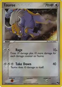 Tauros (Japanese: ケンタロス Kentauros) is a Colorless-type Basic Pokémon card. It was first released as part of POP Series 2.