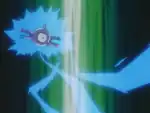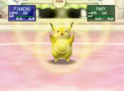 Pikachu releases a stream of electricity at the opponent from the tip of its tail or its body, paralyzing it. | ||