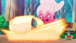 Tinkatuff carries a large, gray, crude yet sturdy hammer, with loose metal plates for the hammer head and what appears to be the old hammer Tinkatuff had as a Tinkatink on top of the shaft. Tinkatuff makes its hammer using metal it collects from groups of Pawniard and Bisharp, which it preys on; the animated series also depicted Tinkatuff attacking Corviknight to steal its feathers for the hammer. Two Tinkatuff will smash their hammers together in order to test out the hammers' strength. As depicted in HZ109, forging the hammer will trigger Tinkatuff's Evolution into Tinkaton. It is a female-only species. Tinkatuff largely resides in various ruins across Paldea, though it is also said to live in piles of scrap metal.