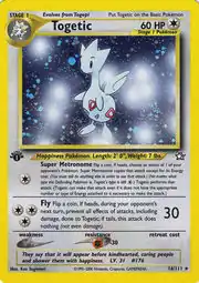 Togetic (Japanese: トゲチック Togechick) is a Colorless-type Stage 1 Pokémon card. It is part of the Neo Genesis expansion.