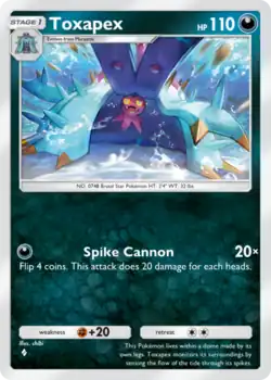 Toxapex (Japanese: ドヒドイデ Dohidoide) is a Darkness-type Stage 1 Pokémon card in Pokémon Trading Card Game Pocket. It is part of the Celestial Guardians expansion.