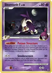 Skuntank G - Skuntank G combos well with Toxicroak G because of its Poison Structure Poké-Power. If the Toxitank player has a Stadium card in play, they can use Poison Structure to Poison both Active Pokémon. However, since it does not affect Pokémon SP, it will generally only Poison the opponent's Active Pokémon, allowing Toxicroak G's Deep Poison attack to do more damage and nullifying any Poké-Powers the affected Pokémon possesses.