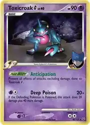 Toxicroak G - This Toxicroak G, a Psychic-type Pokémon from the Platinum expansion, is the deck's main attacker. Its Anticipation Poké-Body prevents all effects of attacks except damage done to Toxicroak G, making it immune to Machamp's Take Out attack, Gengar's Shadow Room attack, and the attacks of various other popular Pokémon of the era. Toxicroak G's only attack, Deep Poison, does 60 damage for only . If the Defending Pokémon is Poisoned by Skuntank G, Toxicroak G can do significant damage with only one energy attachment, provided Energy Gain is attached.
