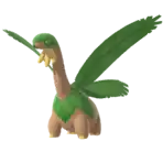 Tropius is a large, sauropod-like Pokémon with a brown body wrapped in green leaves on its chest and head. It possesses large, broad green leaves on its back, which it uses for flight and for sugar production via photosynthesis. Despite being very big and bulky, it is surprisingly maneuverable in the air. It has a long neck with a thin black line around it. It uses its neck for reaching treetops to gorge on its most favored fruit. Since it ate only this kind of fruit continuously, the fruit began to grow around its neck. These yellow, banana-like fruits can be picked and consumed by other Pokémon or humans, and grow twice a year because of the rapid production of sugar in Tropius's leaves. Its feet have toenails the same color as its fruit.